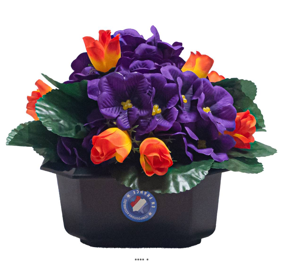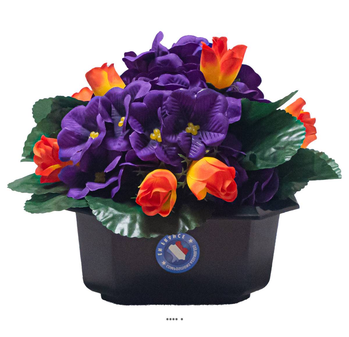 Composition fleurs artificielles cimetière pot carré violettes et mini roses H 17 cm D 24 cm Rouge-o