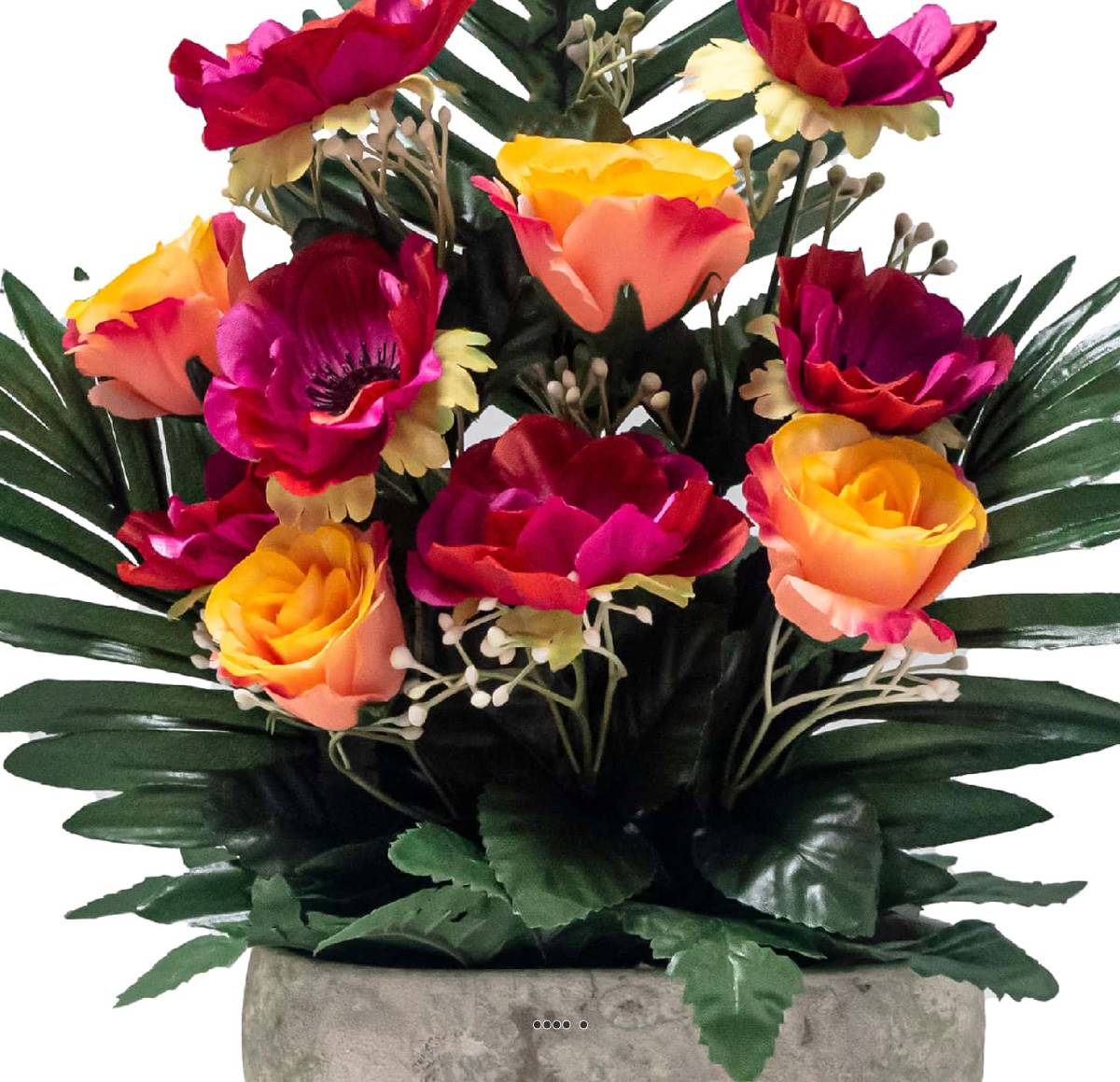 Composition de la jardinière pour cimetière : Cette composition est richement garnie de Boutons de Roses artificiels, de fausses Anémones en tissu, de Gypsophile factice et de feuillage divers.