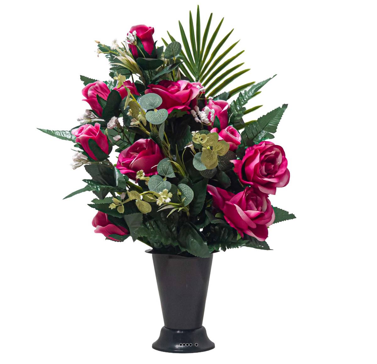 Pot Cône de Roses fleurs artificielles pour le cimetière H 57 cm D 38 cm Fushia