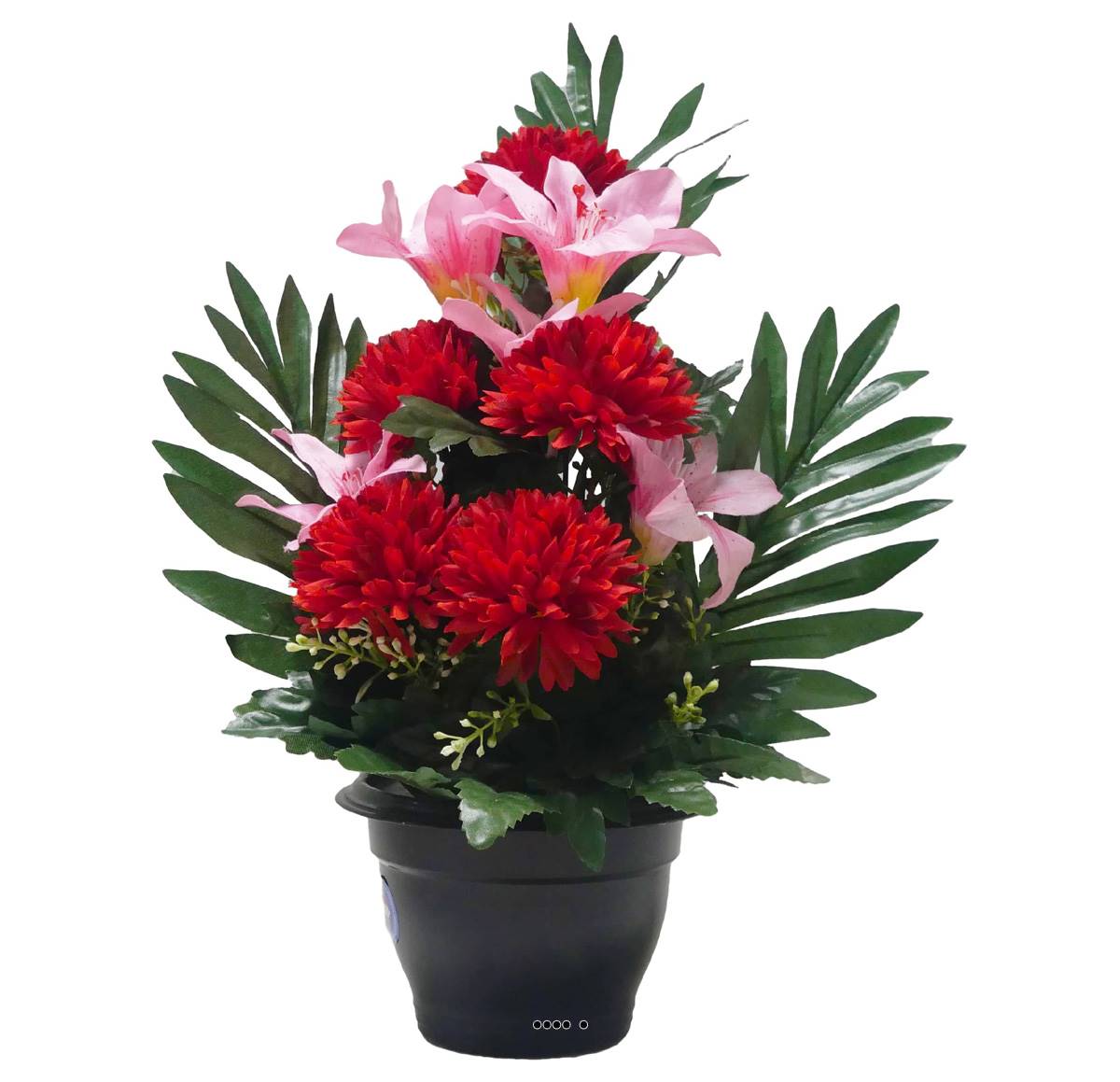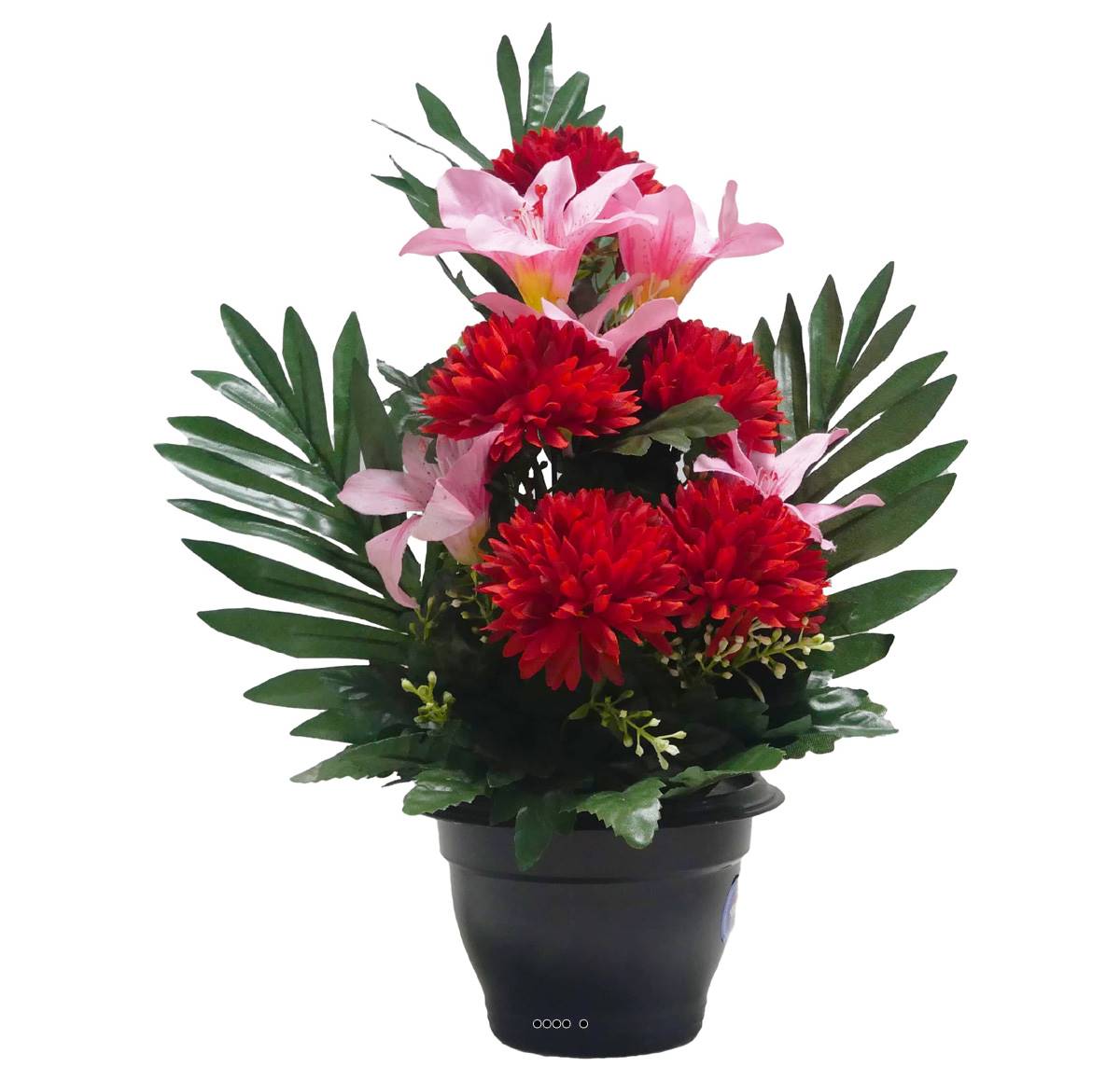 Pot de Chrysanthemes fleurs artificielles pour le cimetière H 38 cm D 22 cm Rouge