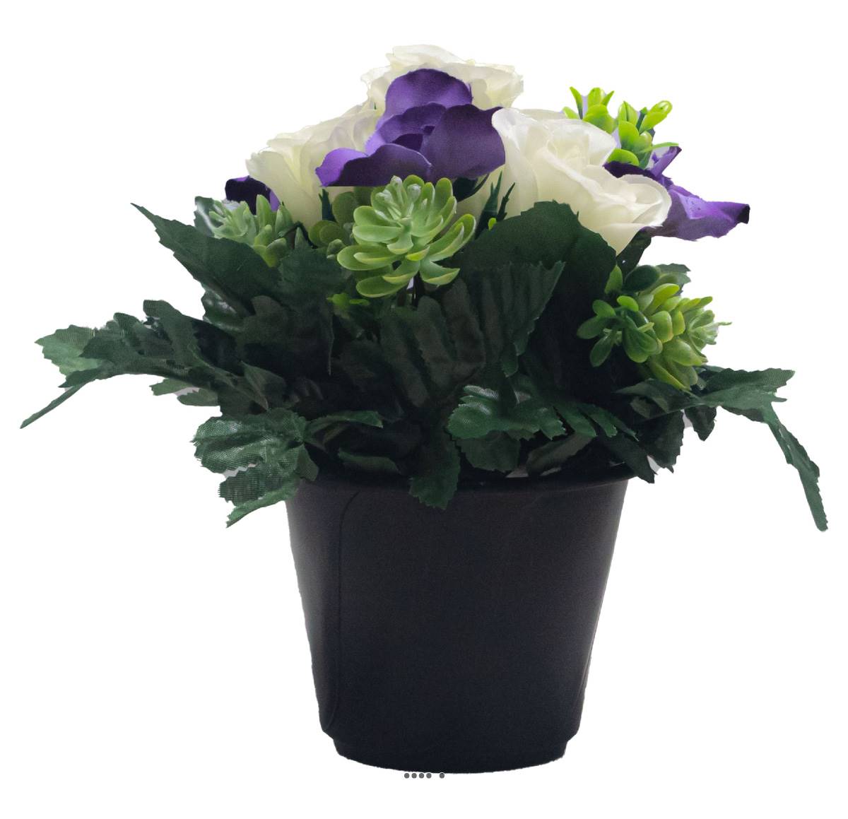 Composition de la jardinière pour cimetière : Cette composition est richement garnie de Roses artificielles, de fausses Pensées et de feuillage divers.