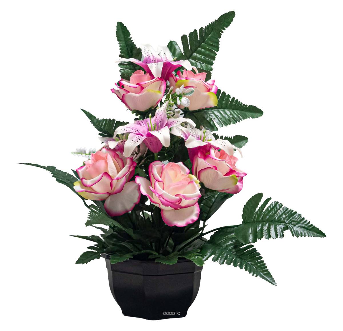 Vasque de Roses et Lys fleurs artificielles pour le cimetière H 43 cm Lg 23 cm Rose pâle